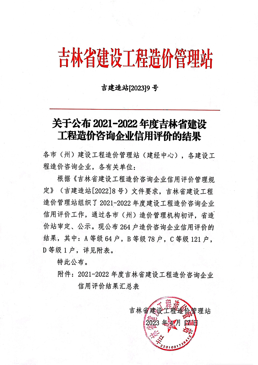 关于公布2021-2022年度吉林省建设工程造价咨询企业信用评价结果的通知