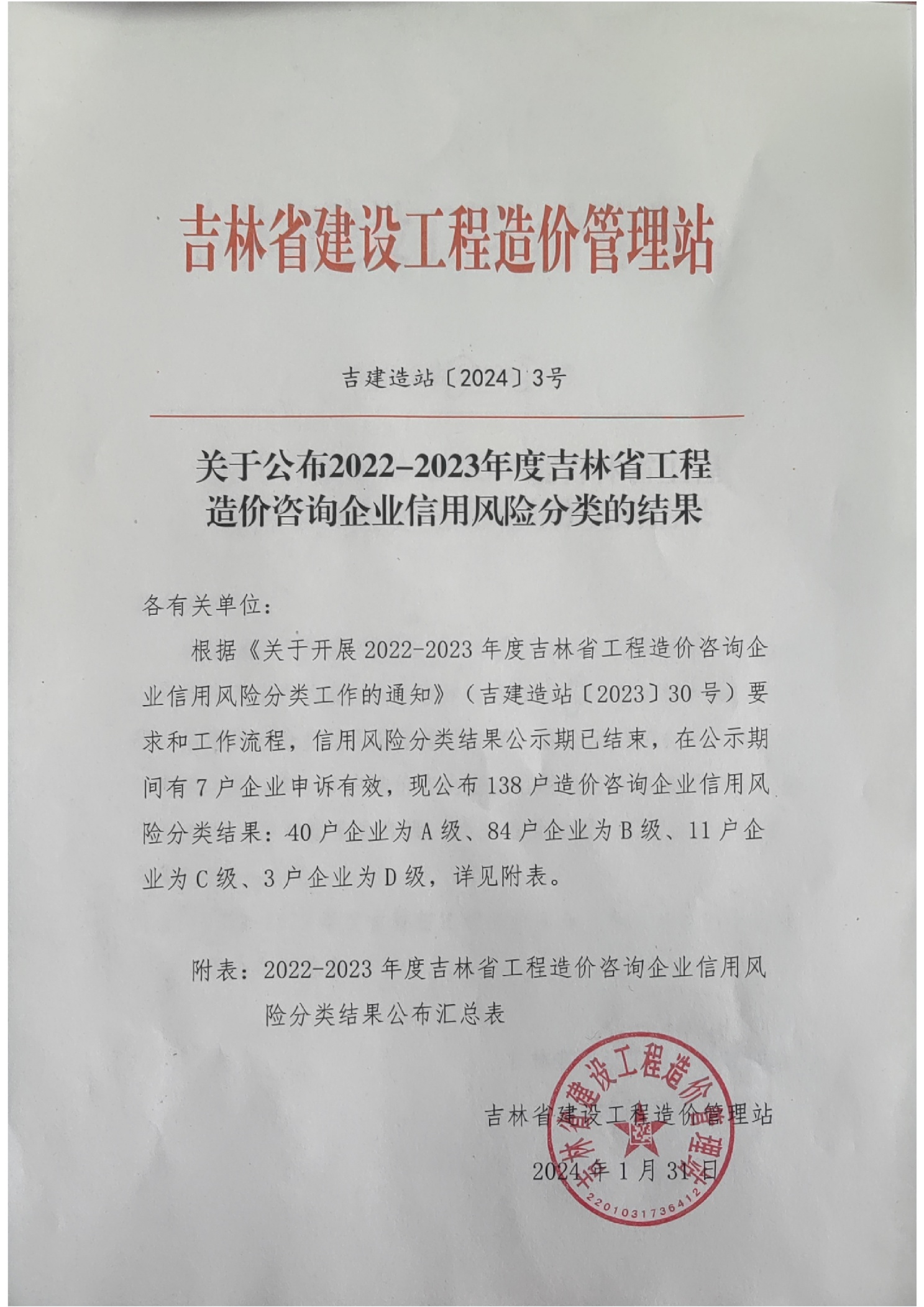 关于公布2022-2023年度吉林省工程造价咨询企业信用风险分类的结果