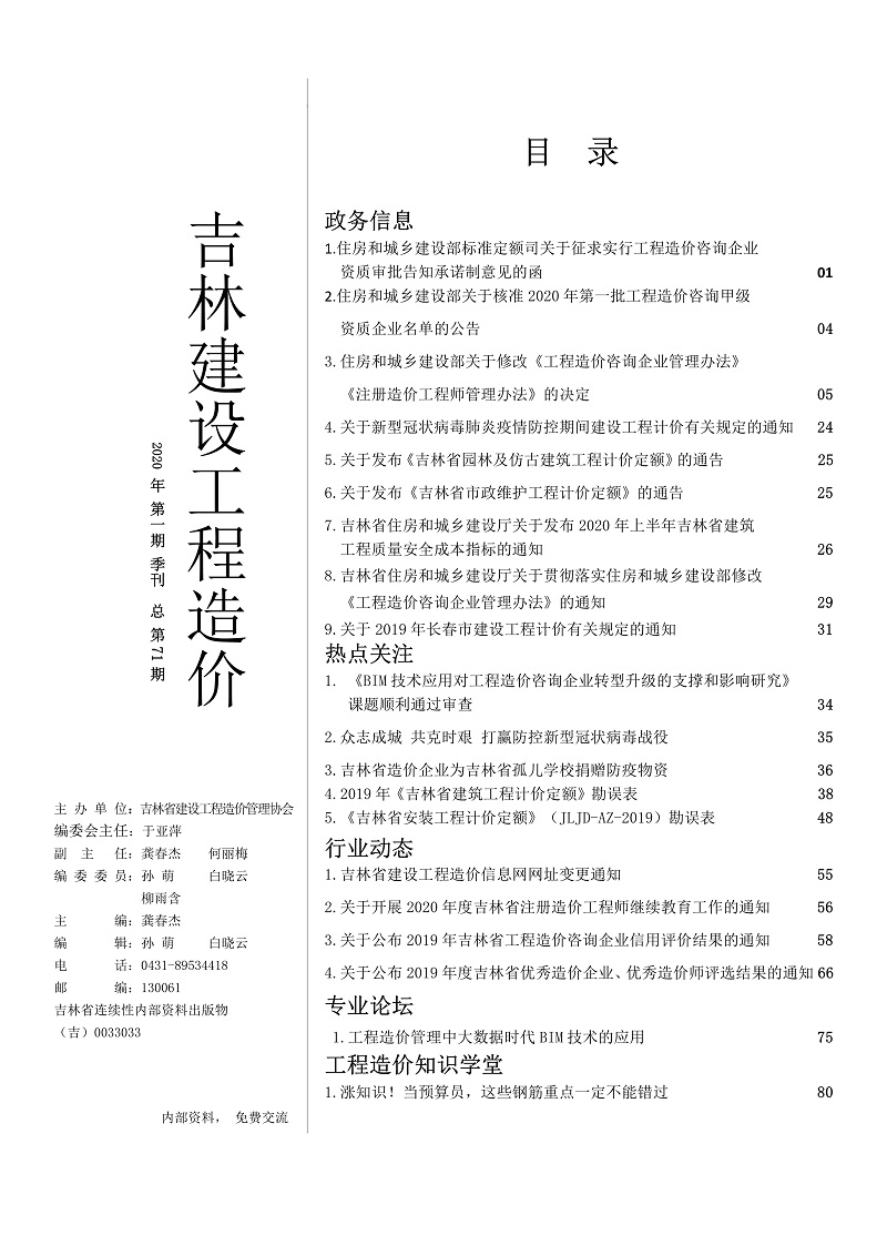 《吉林建设工程造价》2020年第一期季刊