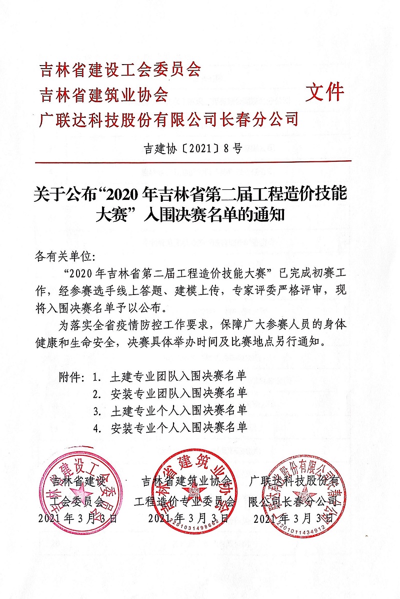 关于公布“2020年吉林省第二届工程造价技能大赛”入围决赛名单的通知