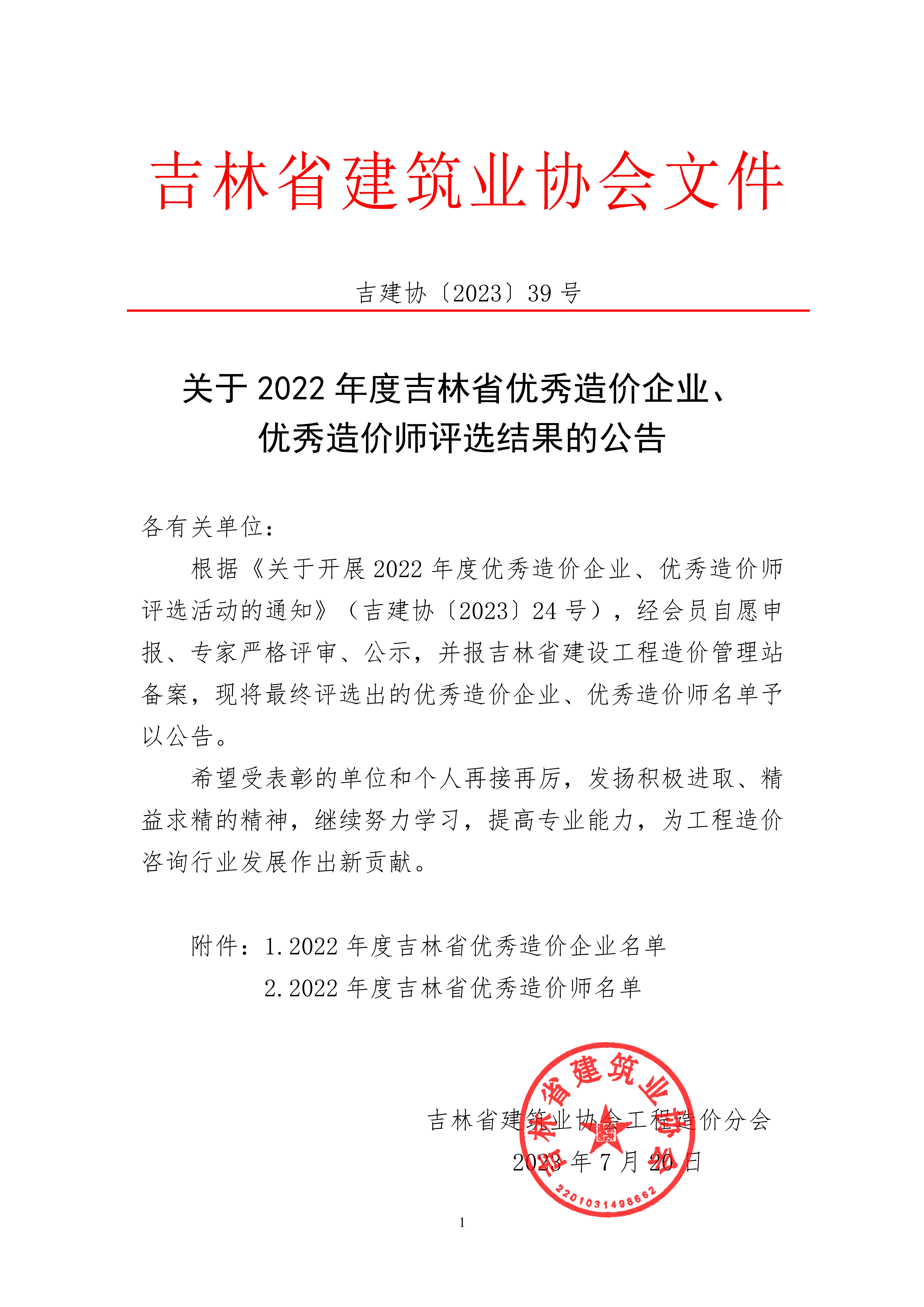 关于2022年度吉林省优秀造价企业 优秀造价师评选结果的公告