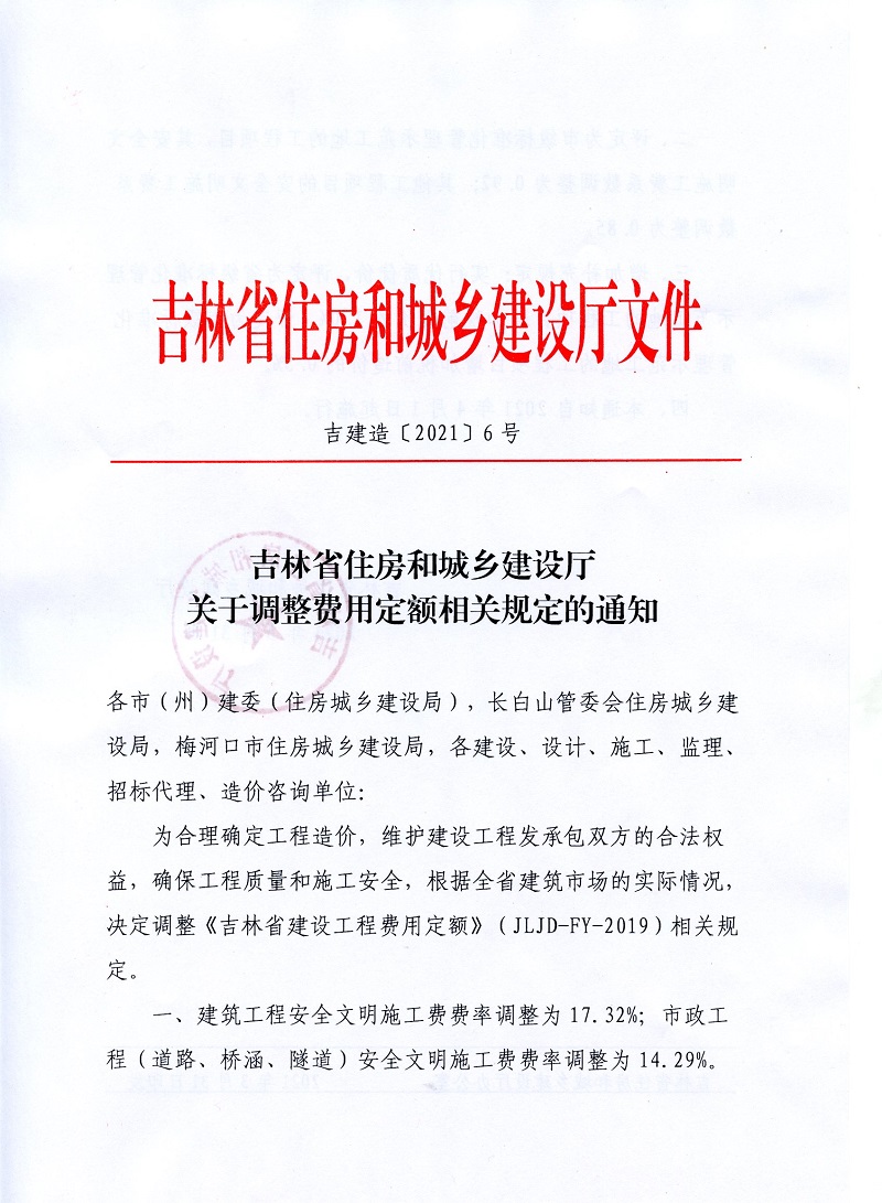 吉林省住房和城乡建设厅关于调整费用定额相关规定的通知