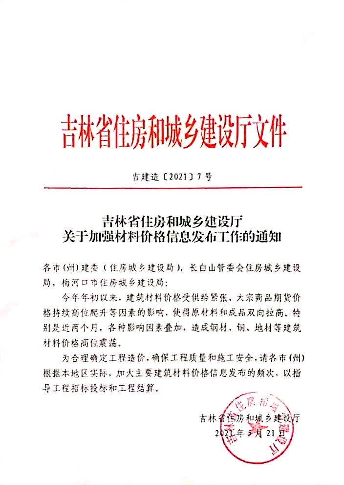 吉林省住建厅关于加强材料价格信息发布工作的通知